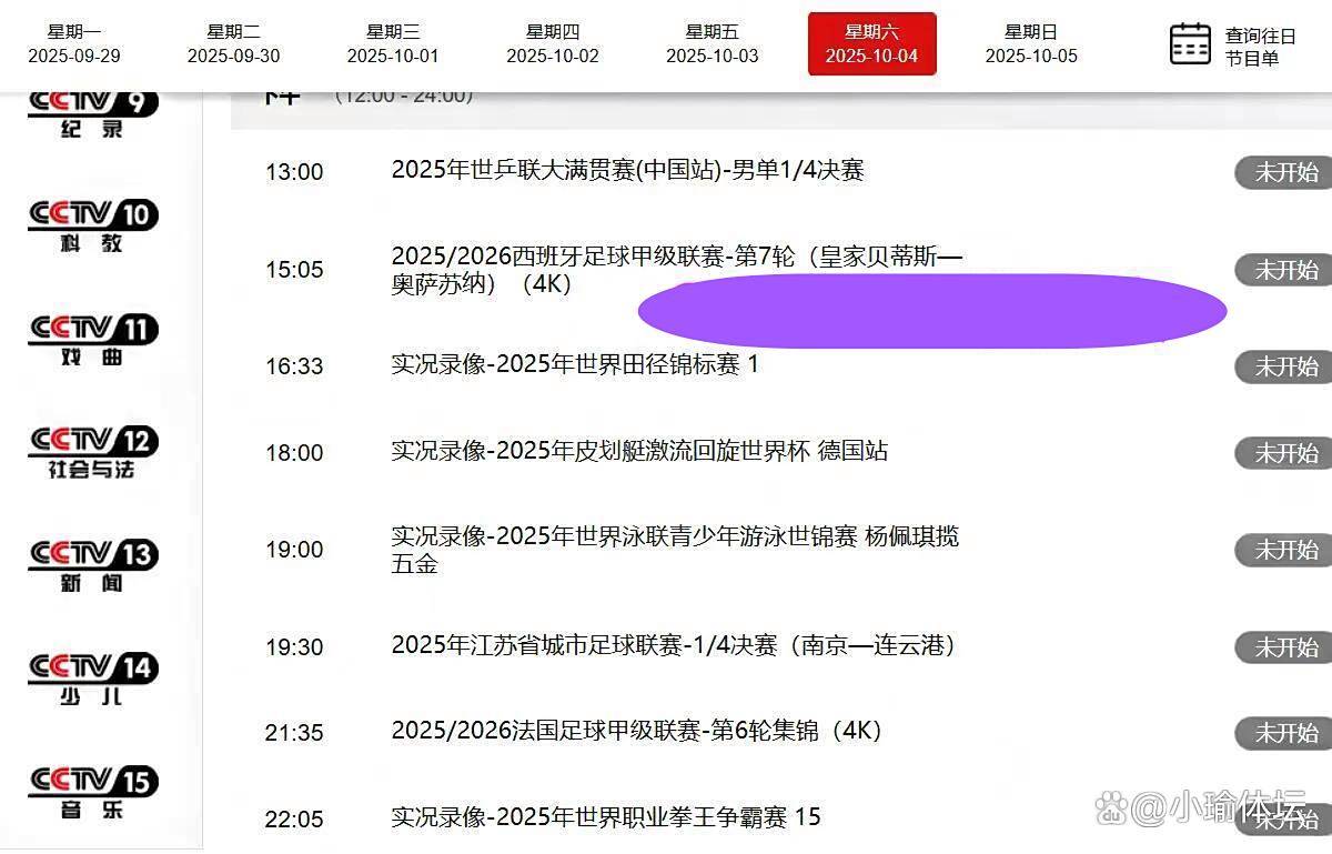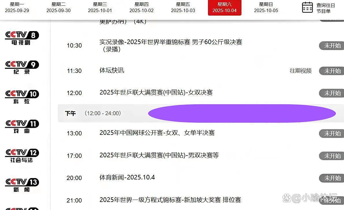 这个比赛日的电视转播表呈现了罕见的拥挤状态。 CCTV-5从中午12点开始直播WTT赛事,傍晚5点切换至F1排位赛,晚间10点继续直播英超比赛。 CCTV-5 频道则在下午1点加入WTT直播,晚间7点35分独家直播苏超1/4决赛。