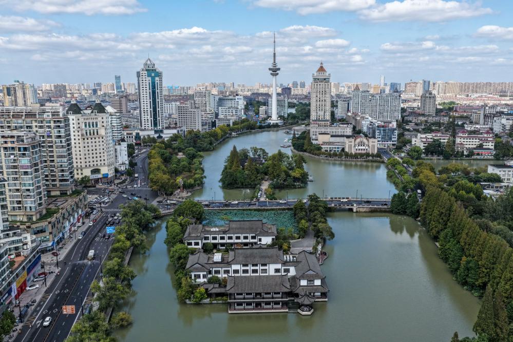 6月28日,人们在江苏省泰州市海陵区桃园景区游玩(无人机照片)。桃园位于江苏省泰州市凤城河风景区东岸,东接泰州老街,是当地城市八景之一。新华社发(汤德宏 摄)
