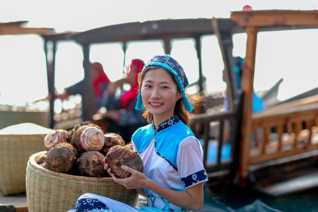 在江苏泰州兴化东罗村举办的农民丰收节主题活动上,农民在“水上市集”展示特色农产品(2018年9月23日摄)。新华社发(汤德宏 摄)