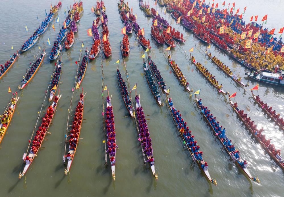4月6日,2025泰州姜堰溱潼会船在江苏省泰州市姜堰区溱湖国家湿地公园开幕,五百多条各式船只和上万名会船选手飞篙走桨、弄潮击浪,演绎历久弥新的民俗画卷。选手们参加会船比赛(无人机照片)。新华社发(汤德宏 摄)