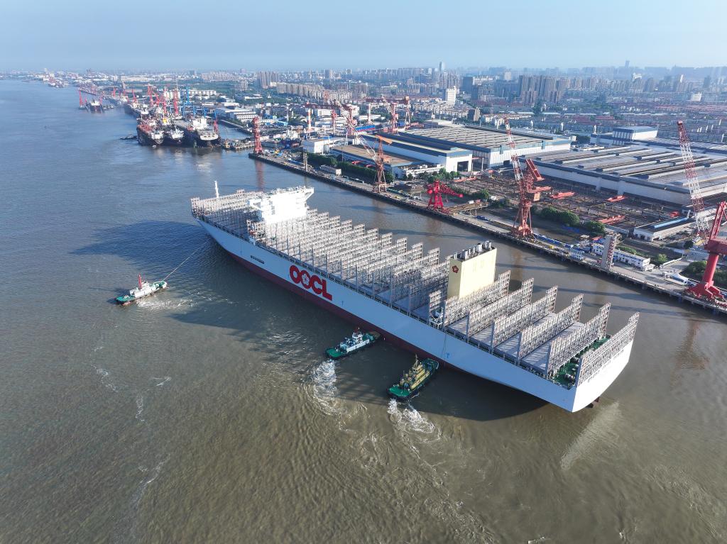 2024年8月30日,超大型集装箱船“东方葡萄牙”从长江南通段水域前往相关海域试航(无人机照片)。新华社记者 季春鹏 摄