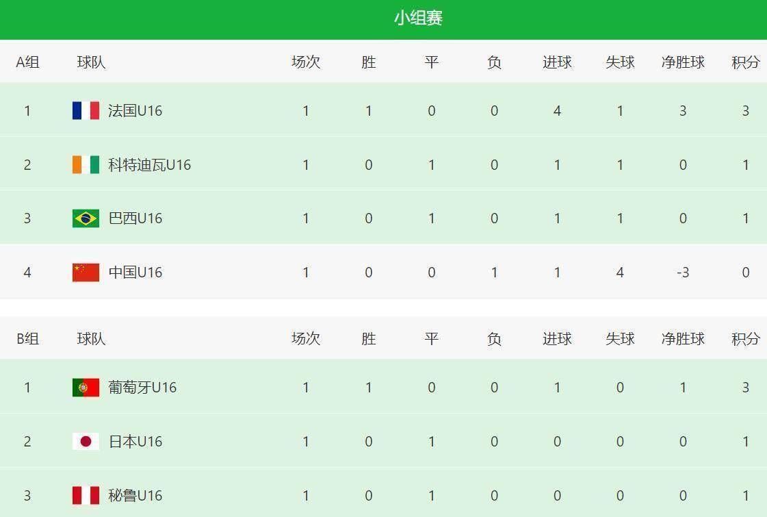 体育,足球,波胆,反波胆,角球,串关,大小球,世界杯,欧洲杯,比分,足球比分,赛事,足球赛事,电竞赛事,体育赛事直播,足球直播平台,世界杯直播,足球直播,体育直播,NBA直播,游戏直播,LOL直播北京时间4月1日凌晨,中国足球的未来希望——U16国少队,在法国蒙太古杯的首场比赛中遭遇当头一棒。 面对东道主法国队,小伙子们以1-4的比分惨败,在A组积分榜上暂时垫底。首轮战罢,两个小组的领头羊位置均被欧洲球队占据:A组的法国和B组的葡萄牙。 这场被国内球迷寄予厚望的“小世界杯”之旅,开局便蒙上了一层厚重的阴影。